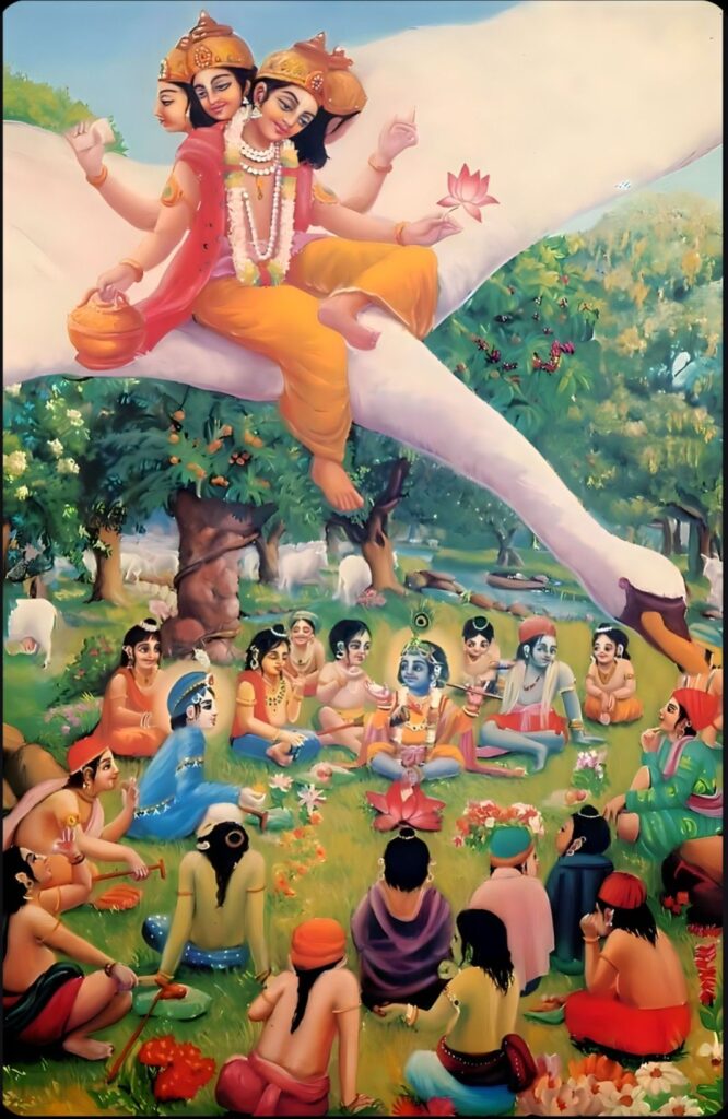 Logo que Brahmā partiu, o Senhor Śrī Kṛṣṇa voltou para as margens do Yamunā e juntou-Se novamente a Seus bezerros e amigos vaqueirinhos, que estavam todos exatamente da mesma maneira que estavam no dia que haviam desaparecido. Kṛṣṇa havia deixado Seus amigos na beira do Yamunā enquanto eles almoçavam, e, embora tivesse voltado somente um ano depois, os vaqueirinhos pensaram que Kṛṣṇa voltara em um segundo. É assim que funcionam as diferentes energias e atividades de Kṛṣṇa. Declara-se no Bhagavad-gītā que o próprio Kṛṣṇa reside no coração de todos e que Ele causa tanto a lembrança como o esquecimento. Todas as entidades vivas são controladas pela energia suprema do Senhor e ora se lembram, ora se esquecem de sua posição constitucional. Seus amigos, sendo controlados desta maneira, não podiam entender que, durante um ano inteiro, estiveram ausentes da margem do Yamunā e estiveram sob o encanto da ilusão de Brahmā. Quando Kṛṣṇa apareceu diante dos meninos, eles pensaram que Kṛṣṇa voltara em um minuto. Começaram a rir pensando que Kṛṣṇa não queria deixar a companhia deles na hora do almoço e, muito alegres, convidaram-no: “Caro amigo Kṛṣṇa, Você voltou tão depressa! Tudo bem, ainda não começamos a almoçar, não tomamos nem um punhado de comida. Então, venha juntar-Se a nós e vamos comer todos juntos”. Kṛṣṇa sorriu e aceitou o convite deles e começou a desfrutar a companhia de Seus amigos na hora do almoço. Enquanto comia, Kṛṣṇa pensava: “Estes meninos acham que voltei em um segundo, mas eles não sabem que, no ano que passou, estive envolvido com as atividades místicas do senhor Brahmā”.
