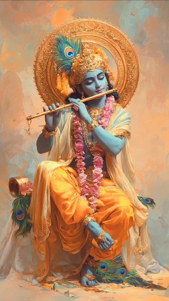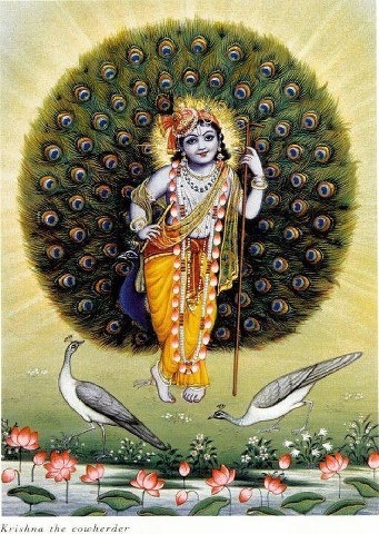 “Que eu ofereça minhas repetidas e respeitosas reverências ao filho de Mahārāja Nanda, que está diante de mim com búzio, brincos e pena de pavão na cabeça. Seu rosto é belo; Ele está usando um elmo, está enguirlandado com flores silvestres e tem um punhado de comida na mão. Leva conSigo um cajado, uma corneta de chifre de búfalo e uma flauta e está de pé diante de mim com Seus pezinhos de lótus”.