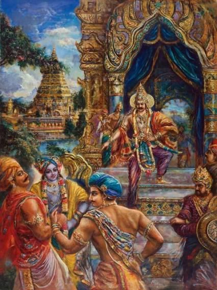 Em seguida, ele se voltou para Balarāma e Lhe disse: “Você, Balarāma, pode lutar junto com Ele se quiser e, se tiver paciência, pode esperar para ser morto por minhas flechas. Assim, poderá ser promovido ao céu”. Afirma-se no Bhagavad-gītā que um kṣatriya pode se beneficiar de duas maneiras quando luta: Se um kṣatriya consegue a vitória enquanto luta, ele goza os resultados da vitória, mas, mesmo que seja morto, será promovido ao reino celeste.