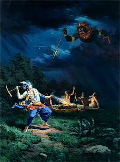 O Senhor Balarāma preparou-Se para encontrar o demônio Balvala. Sempre que o demônio atacava o lugar sagrado, havia uma fortíssima tempestade de granizo, o céu inteiro ficava encoberto por poeira e a atmosfera se sobrecarregava com um odor fétido. Logo após isso, o pernicioso demônio Balvala começava a despejar torrentes de excremento e urina e outras substâncias impuras na arena de sacrifício. Depois desse ataque, o próprio demônio surgia com um grande tridente em sua mão. Ele era uma pessoa gigantesca, e seu corpo negro parecia uma enorme massa de carbono. Seu cabelo, barba e bigode pareciam vermelhos como o cobre, e, por causa da sua longa barba e bigode, sua boca parecia perigosa e feroz. Tão logo viu o gênio maligno, o Senhor Balarāma preparou-Se para atacá-lo. Em primeiro lugar, Ele pensou como poderia esmagar o grande demônio em pedaços. Em seguida, o Senhor Balarāma convocou Seu arado e maça e eles apareceram imediatamente diante dEle. O demônio Balvala estava voando no céu, e, na primeira oportunidade, o Senhor Balarāma arrastou-o com Seu arado e, furiosamente, esmagou a cabeça do demônio com sua maça. O golpe de Balarāma fraturou a fronte da criatura fazendo com que sangue fluísse em profusão. Gritando ruidosamente, o demônio, que fora uma grande perturbação para os brāhmaṇas piedosos, desmoronou na terra como uma imensa montanha de pico de óxido vermelho ao ser golpeada por um raio.