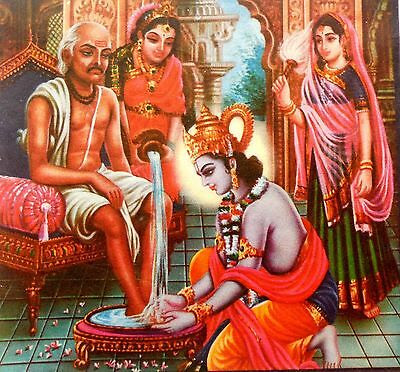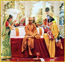 Depois que o brāhmaṇa foi recebido de uma forma adequada e sentou-se no próprio leito almofadado do Senhor Kṛṣṇa, ele e Kṛṣṇa tomaram a mão um do outro e começaram a falar sobre o início de sua vida, quando ambos viviam sob a proteção do gurukula (uma escola internato). O Senhor Kṛṣṇa disse: “Meu querido amigo brāhmaṇa, você é uma personalidade assaz inteligente e conhece muito bem os princípios da vida religiosa. Eu acredito que, depois que você terminou sua educação na casa de nosso mestre e o remunerou suficientemente, você deve ter regressado à sua casa e aceitado uma esposa adequada. Sei muito bem que, desde o princípio, você não tinha apego ao modo materialista de vida, tampouco desejava ser materialmente muito opulento e, por consequência, você agora está necessitado. Neste mundo material, pessoas que não são apegadas à opulência material são muito raramente encontradas. Tais pessoas desapegadas não têm o mínimo desejo de acumular riqueza e prosperidade para a satisfação dos sentidos, mas, às vezes, elas acumulam dinheiro unicamente para exibir a vida exemplar de um chefe de família. Elas demonstram como, por distribuição apropriada de riqueza, a pessoa pode se tornar um chefe de família ideal e, ao mesmo tempo, um grande devoto. Tais chefes de família ideais serão considerados os seguidores de Meus passos. Eu espero, Meu querido amigo brāhmaṇa, que você se lembre de todos aqueles dias de nossa vida escolar quando você e Eu estávamos vivendo juntos no internato. De fato, qualquer conhecimento que tenhamos recebido na nossa existência foi acumulado em nossa vida de estudante”.