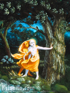 Kṛṣṇa continuou falando com Seu amigo brāhmaṇa: “Meu querido amigo, penso que você se lembra de nossas atividades durante os dias quando vivíamos como estudantes. Talvez se lembre quando, certa vez, fomos apanhar lenha na floresta por ordem da esposa do guru. Enquanto juntávamos a madeira seca, acabamos por adentrar a floresta densa e nos perdemos. Houve uma inesperada tempestade de poeira e, em seguida, nuvens e raios no céu e o som explosivo de um trovão. Logo em seguida, o Sol se pôs e nós estávamos perdidos na selva escura. Depois disso, começou uma chuva pesada; o solo inteiro ficou inundado com água e não pudemos localizar o caminho de regresso ao āśrama de nosso guru. Talvez você se lembre daquela chuva pesada – não era de fato uma chuva, mas um tipo de devastação. Por causa da tempestade de poeira e da chuva pesada, começamos a nos sentir muito doloridos e, em qualquer direção que virássemos, ficávamos confusos. Naquela condição angustiante, pegamos na mão um do outro e tentamos descobrir nosso caminho de volta. Passamos a noite inteira daquele modo, e, de manhã cedo, quando nossa ausência foi percebida pelo nosso gurudeva, ele ordenou a seus outros discípulos que nos procurassem. Ele também foi com eles e, quando eles nos localizaram na selva, acharam-nos muito aflitos”.