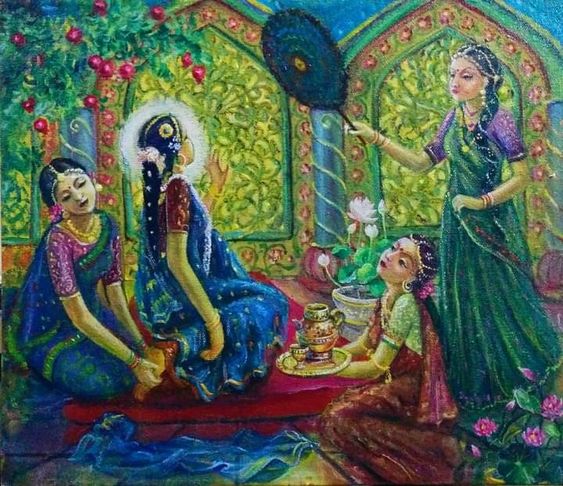 O que segue é uma conversa que consiste nas perguntas feitas a Rambhā, uma beldade famosa, e em suas respostas correspondentes. Rambhā foi indagada: “Minha querida Rambhā, quem és tu?”. Ela respondeu: “Eu sou a paz personificada”. Pergunta: “Por que, então, estás no céu?”. Resposta: “Estou no céu para experimentar a beleza suprema da Verdade Absoluta”. Pergunta: “Por que, então, estás com olhar fixo?”. Resposta: “Apenas para examinar a beleza suprema da Verdade Absoluta”. Pergunta: “Por que, então, pareces estar com a mente perturbada?”. Resposta: “Porque o Cupido está atuando”. No exemplo supracitado, também não há representação pervertida de doçuras, porque, no todo, o êxtase do amor conjugal excede a posição neutra do serviço devocional.