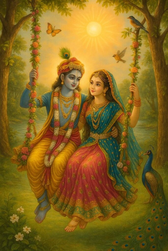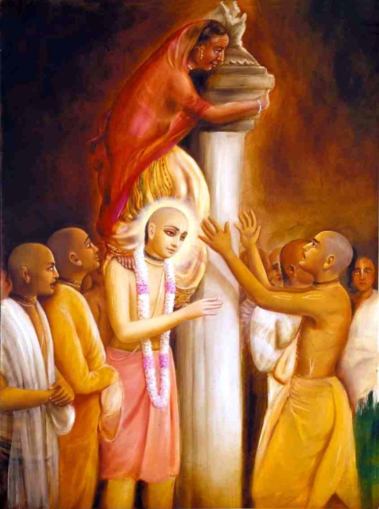 3 – Acima temos a imagem de uma devota subindo nas costas do Senhor Caitanya para ver as deidades do templo de Jagannatha Puri. Você sabia que Mahaprabhu não permitiu que os devotos tirassem ela dali porque sua devoção era tão imaculada que ela estava fora de si por conta da grande devoção.