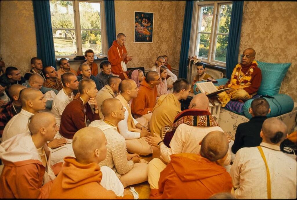 Kuntīdevī diz que aqueles que estão intoxicados dessa maneira não podem se dirigir ao Senhor com um sentimento sincero. Eles não conseguem dizer de coração, jaya rādhā-mādhava: “Todas as glórias a Rādhā e Kṛṣṇa!” Eles perderam seu sentimento espiritual, e não conseguem se dirigir ao Senhor com sinceridade, porque não têm conhecimento. “Oh! Deus é para os pobres”, eles pensam. “Os pobres não têm alimento suficiente. Deixe-os irem à igreja e orar: ‘Ó Deus, dê-nos o pão de cada dia!’, mas eu tenho pão suficiente, por que eu deveria ir à igreja?”