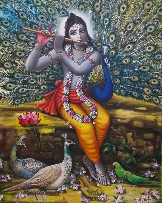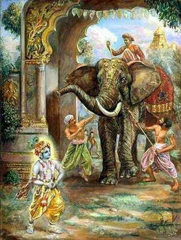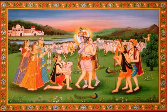 Os amigos vaqueiros de Kṛṣṇa ficavam tão felizes em Sua companhia que exprimiam os sentimentos transcendentais que experimentavam dentro de si deste modo: “Nosso querido Kṛṣṇa, estás sempre atarefado tomando conta das vacas que estão espalhadas por toda a bela Vṛndāvana. Tens uma bela guirlanda, um pequeno búzio, uma pluma de pavão em Teu turbante, roupa de seda amarela, enfeites de flores karṇikāra em Tuas orelhas e uma guirlanda de flores mallikā sobre Teu peito. Provido de tamanha formosura, quando finges, tal qual um ator, que estás lutando conosco, concedes-nos ilimitada bem-aventurança transcendental”.