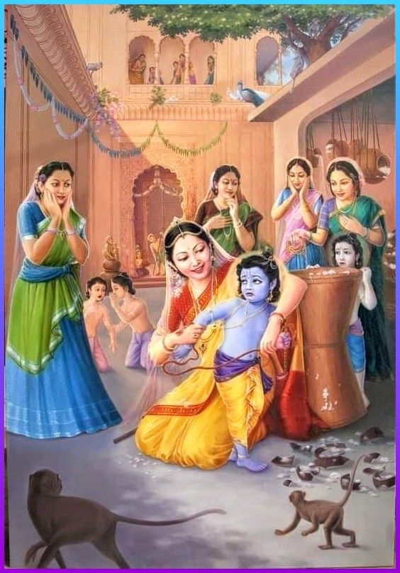 Quando viu que Kṛṣṇa estava com tanto medo, Yaśodā também ficou perturbada. Na verdade, ela não queria que Kṛṣṇa sofresse com o castigo. Não era esse o seu desejo. Mas existe um sistema, ainda corrente na Índia, que, quando uma criança é muito levada e causa muitas perturbações, sua mãe a amarra em algum lugar. Por ser esse um sistema muito comum, mãe Yaśodā o adotou.
