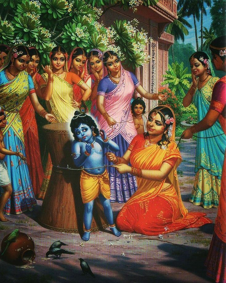 Este passatempo apresenta outra opulência de Kṛṣṇa – Sua opulência de beleza. Kṛṣṇa tem seis opulências: toda riqueza, toda força, toda influência, todo conhecimento, toda renúncia e toda beleza. A natureza de Kṛṣṇa é que Ele é maior do que o maior e menor que o menor (aṇor aṇīyān mahato mahīyān). Nós oferecemos reverências a Kṛṣṇa com respeito e veneração, mas ninguém vai até Kṛṣṇa com uma corda, dizendo: “Kṛṣṇa. Você cometeu uma ofensa, e agora eu vou amarrá-lO”. Porém, esta é uma prerrogativa do devoto mais perfeito, e Kṛṣṇa deseja ser tratado dessa maneira.
