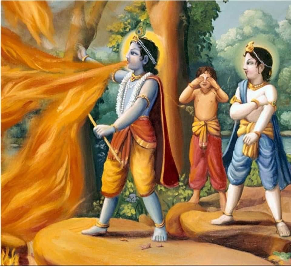 Em outra ocasião, os vaqueirinhos ficaram rodeados por fogo. Não conhecendo ninguém além de Kṛṣṇa, eles O chamaram imediatamente, e Kṛṣṇa estava pronto: “Sim!” E Kṛṣṇa imediatamente engoliu todo o fogo. Muitos demônios atacavam os meninos, e diariamente eles voltavam para suas mães dizendo: “Mamãe, Kṛṣṇa é maravilhoso”, e eles, então, lhes explicavam o que tinha acontecido naquele dia. E as mães respondiam: “Sim, nosso Kṛṣṇa é maravilhoso”. Eles não sabiam que Kṛṣṇa era Deus, a Pessoa Suprema. Eles só sabiam que Kṛṣṇa era maravilhoso. Isso é tudo. E quanto mais eles viam as atividades maravilhosas de Kṛṣṇa, mais aumentava seu amor. “Talvez Ele seja um semideus”, eles pensavam. Quando Nanda Mahārāja, o pai de Kṛṣṇa, conversava com seus amigos, eles falavam sobre Kṛṣṇa e diziam: “Ó Nanda Mahārāja, seu filho Kṛṣṇa é maravilhoso”. E Nanda Mahārāja respondia: “Sim, eu vejo isso. Talvez Ele seja algum semideus”. E, mesmo assim, não havia certeza – “talvez”.