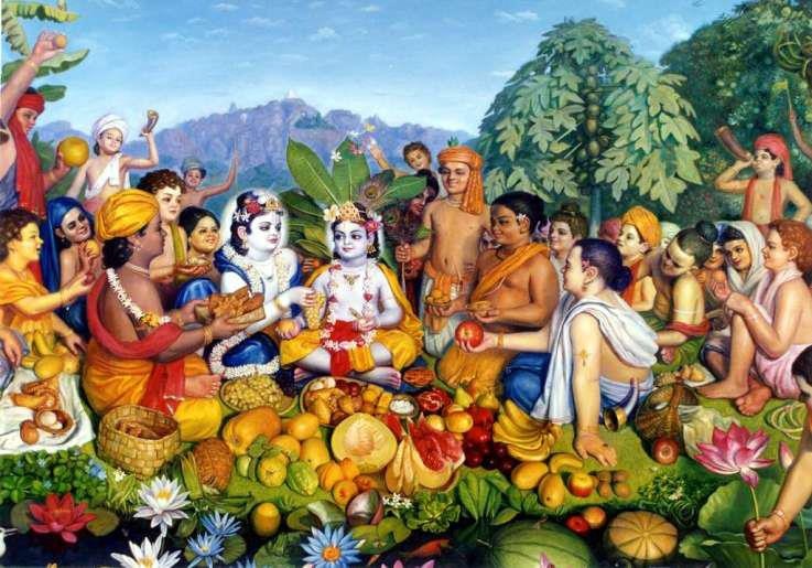 Os vaqueirinhos que brincam com Kṛṣṇa tampouco são comuns, porque alcançaram a perfeição mais elevada de serem capazes de brincar com a Suprema Personalidade de Deus. Como alcançaram esta posição? Kṛta-puṇya-puñjāḥ: através de muitas vidas realizando atividades piedosas. Por muitas, muitas vidas, esses meninos executaram austeridades e penitências para alcançar a mais elevada perfeição da vida. E agora eles têm a oportunidade de brincar com Kṛṣṇa pessoalmente, no mesmo nível. Eles não sabem que Kṛṣṇa é a Suprema Personalidade de Deus, porque esta é a natureza de vṛndāvana-līIā, os passatempos de Kṛṣṇa na aldeia de Vṛndāvana.