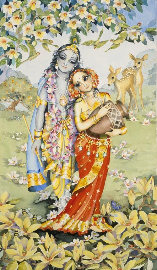 No Kṛṣṇa-karṇāmṛta, Bilvamaṅgala Ṭhākura descreve como Kṛṣṇa Se encontra com Seu devoto com uma pluma de pavão na cabeça, com joias marakata no peito, Seu sorriso sempre encantador, Seus olhos irrequietos e Seu corpo delicadíssimo.