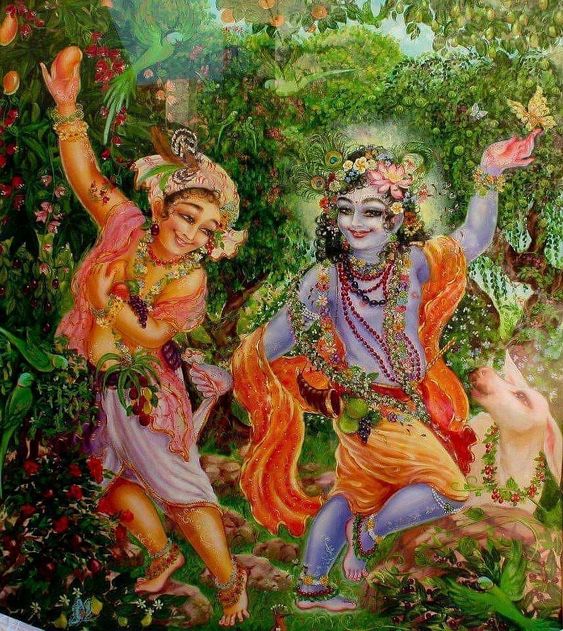 Certas vezes, todos os amigos vaqueirinhos de Kṛṣṇa, juntamente com Balarāma, dançavam juntos em alguma cerimônia. Nesses momentos, as guirlandas penduradas em seus pescoços se mexiam e eles começavam a transpirar. Eles ficavam com os corpos totalmente molhados como resultado de seu dançar extático. Este é um exemplo de fadiga causada pelo dançar.