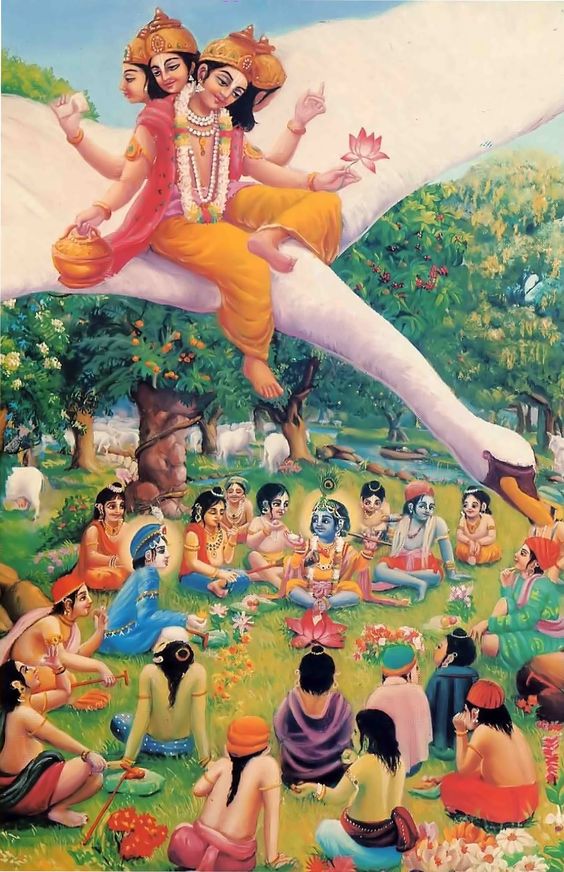 Há também o exemplo do espanto do Senhor Brahmā. No Śrīmad-Bhāgavatam (10.13.51), explica-se que, quando Brahmā compreendeu que aquele vaqueirinho era a própria Suprema Personalidade de Deus, ele ficou aturdido. Todas as suas atividades sensitivas foram interrompidas quando ele novamente viu todos os vaqueirinhos juntamente com Kṛṣṇa. O Senhor Brahmā ficou tão aturdido que parecia ser uma estátua dourada com quatro cabeças. Os habitantes de Vraja também ficaram aturdidos ao descobrirem que Kṛṣṇa erguera a colina Govardhana com Sua mão esquerda.