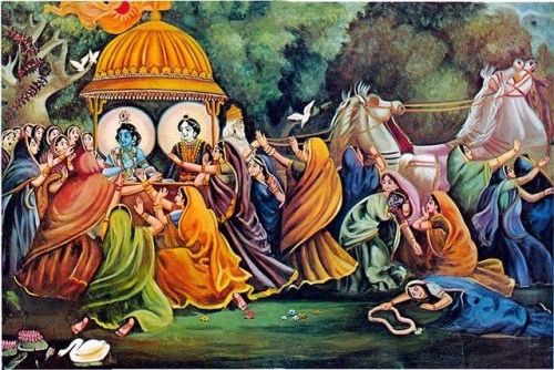 Quando Kṛṣṇa estava de partida para Mathurā na quadriga conduzida por Akrūra, foram ao Seu encontro Yaśodā e todas as gopīs a fim de tentarem proibi-lO de passar e a fim de bloquearem-Lhe o caminho. Nesse momento, Rādhārāṇī estava tão perturbada que, balbuciante, pediu a mãe Yaśodā que, por favor, parasse Akrūra.